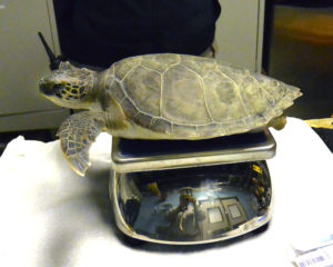Cove was found floating on the water’s surface by citizens in Shelter Cove on Hilton Head Island. Once South Carolina Department of Natural Resources (SCDNR) was called, volunteer transporter Amber Kuehan quickly responded. Michelle Patte, SCDNR Sea Turtle Coordinator, met Amber halfway between Hilton Head and Charleston and transported this little green to our hospital. Upon arrival, Cove was alert and responsive, but he did have a lowered heart rate and was missing a left, rear flipper. Cove is the first patient that we have admitted to our hospital this year!