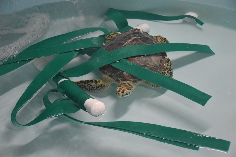 November 1, 2018: Fawkes is one our newest patients in Zucker Family Sea Turtle Recovery! You can now visit Fawkes and see the weight pouch therapy we are using to help him maintain neutral buoyancy when he’s swimming and diving.