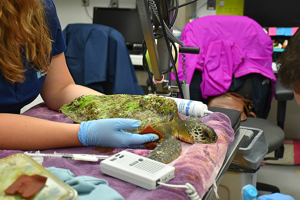 Once in the Care Center, Fred was given a thorough physical exam. Given his heavy epibota load of barnacles and algae, it was clear that he must have been floating lethargic for some time before finally washing up on shore. After running Fred’s blood, the vet team saw that Fred’s blood sugar was low, and he was dehydrated. The vet team treated Fred with vitamins, antibiotics and fluids. Since Fred was hypoglycemic and dehydrated, he received 2 different types of fluid, 5% Dextrose and Normosol-R. The Dextrose was administered under the skin. With both of these fluids on board to help replenish electrolytes and sugar, Fred began to feel a lot better!