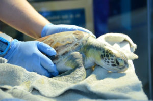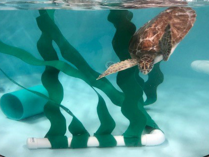 July 15, 2018: Ginny has moved to a new tank and has been doing great. She is gaining weight, eating well and getting all of the vitamins she needs. Staff is also taking her outside for “sun time” a few times each week. Reptiles need UVB light to help them synthesize vitamin D. Sea turtles do not behaviorally bask like other species of reptiles so, even though we have a UVB lamp set up over her tank, we supplement with natural sunlight as often as we can.