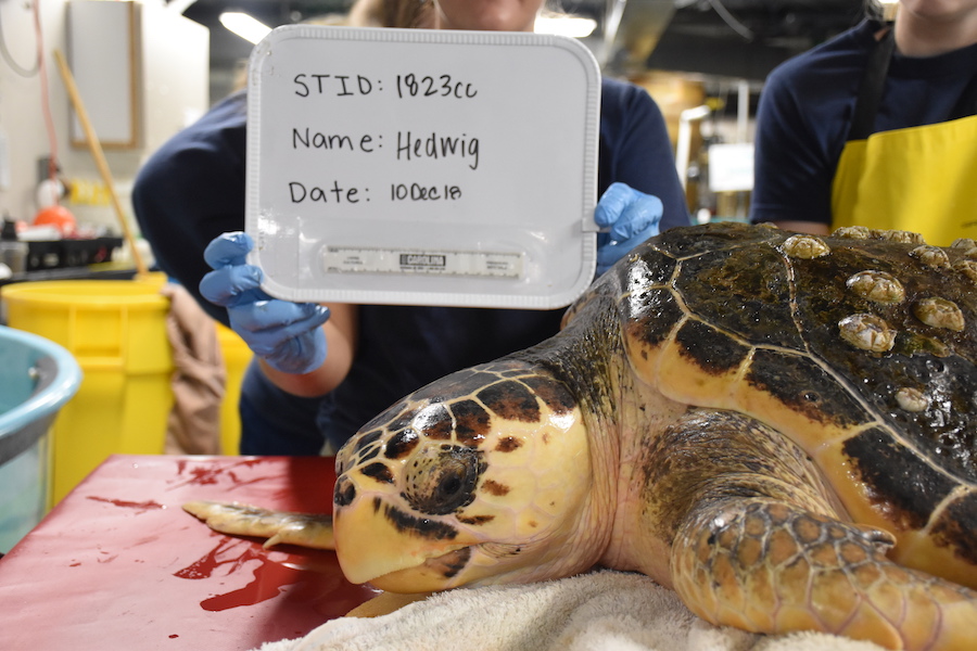 March 15, 2019: Great news for Hedwig! On March 14, Hedwig was released via boat about 45 miles offshore into the gulf stream. Unlike our local waters where the temperature fluctuates throughout the year, the gulf stream maintains around 70°F year round, and is where sub-adult loggerhead sea turtles will migrate to in the winter months to stay warm. We are so happy for Hedwig!