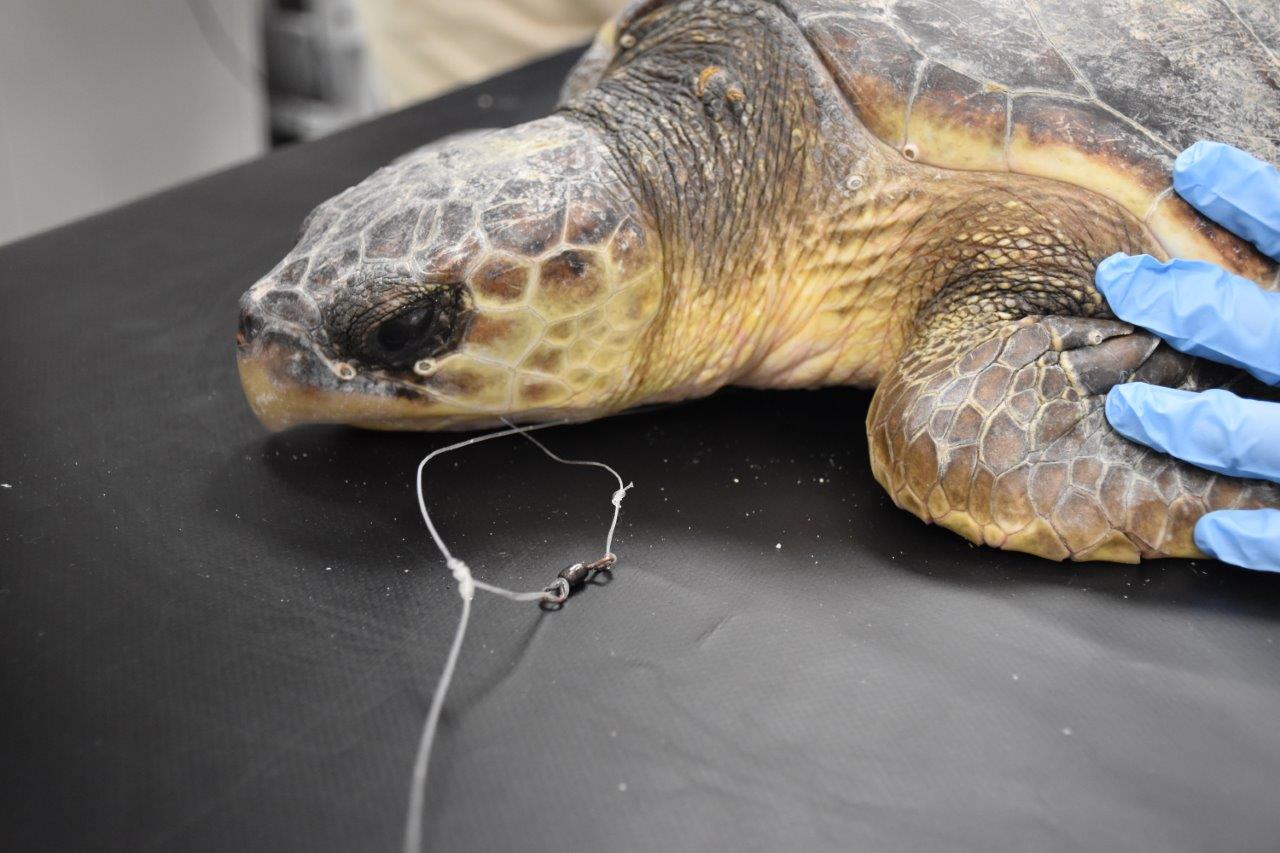 Nigel was a very active patient at admit! The lead and fishing line were securely taped to the carapace and head to prevent them from being caught on his/her flipper. A physical exam, radiographs and a blood pull were taken. Radiographs confirmed the presence of the hook in Nigel’s esophagus, but luckily, there was only one. Nigel had a deep open laceration on top of the neck, a laceration of the left front flipper and a puncture wound near the jaw on the right. Associate Veterinarian, Dr. Julie Cavin, did an oral exam and was able to see the top of the hook in the back of throat. With sedation, Dr. Cavin and our vet staff team was able to remove the hook successfully, no surgery needed! Nigel’s sedation was reversed, and he received fluids, vitamins and antibiotics post-surgery.
