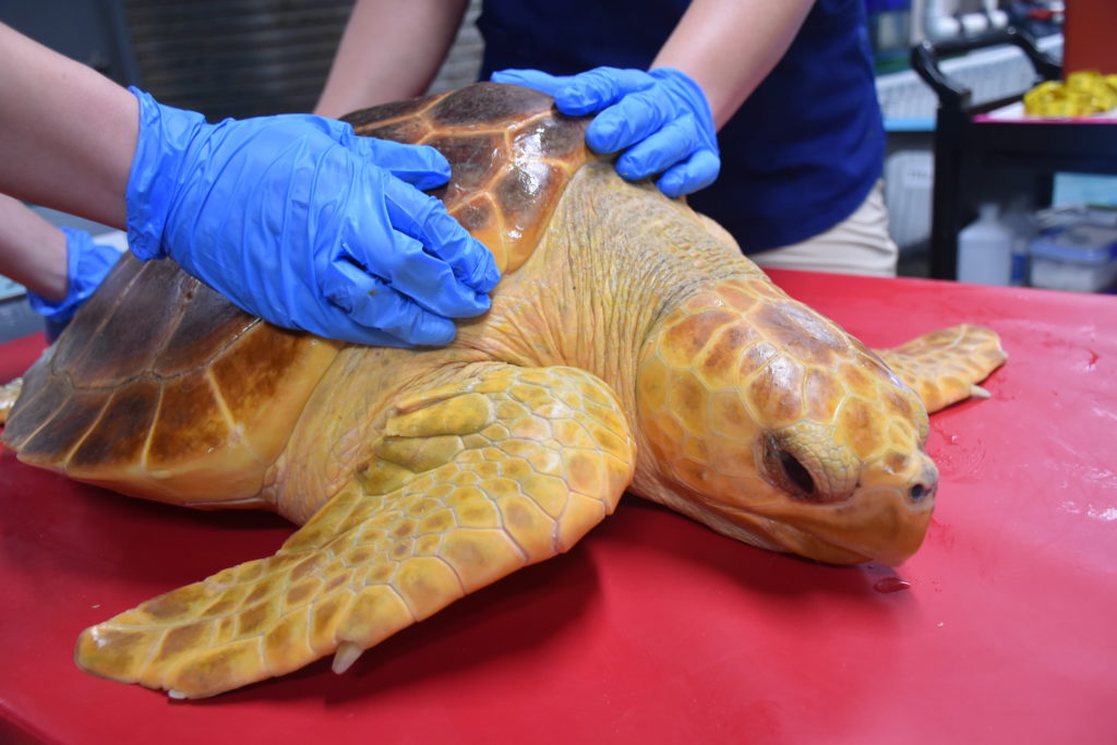 When Dumbledore was brought into the Sea Turtle Care Center he was quickly looked over by our veterinary team. We weighed him, checked his eyes, and gave him a full physical exam. Afterwards, Dumbledore was placed back in his box to warm up a few degrees before he moved into a tank. Overall, Dumbledore was in great condition! He has been prescribed antibiotics to ward off any long-term infection from the cold stunning event.