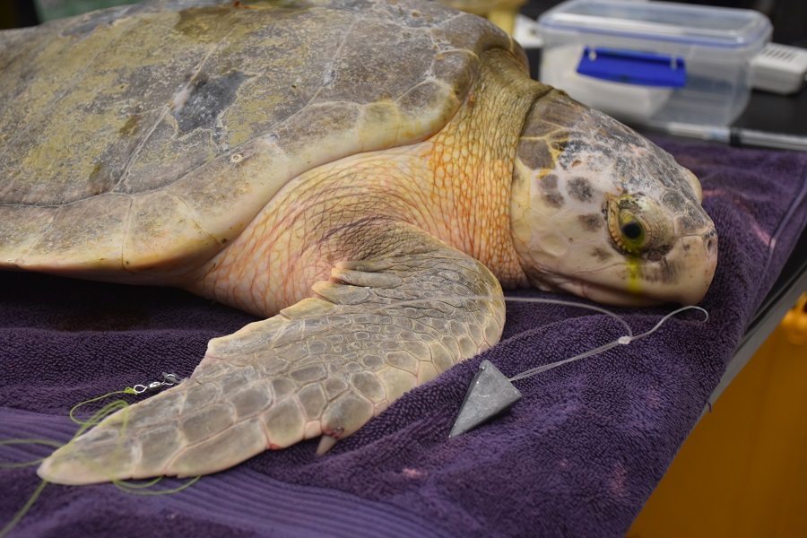 Elliot was hooked by a fisherman off Cherry Grove Pier in the evening on Wednesday May, 6. South Carolina Department of Natural Resources (SCDNR) stranding volunteers responded to the call and were unable to successfully remove the circle hook from Elliot’s tongue. SCDNR permit holder, Linda Mataya then transported Elliot to the South Carolina Aquarium Sea Turtle Care Center for further treatment and care.