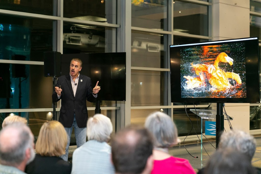 Over 200 guests packed into the Aquarium’s Great Hall on Thursday, February 7. Greeted by a sampling of “aphrodisiac” oysters from Raw 167, chocolate covered strawberries and champagne, the stage was set for a very special speaker, Ron Magill. Ron Magill has had quite a career; he’s been with Zoo Miami for over 40 years, he has a recurring segment on the Dan Lebatard Show on ESPN and makes frequent appearances on Good Morning America and The Today Show. If he looks familiar, it’s because you’ve probably seen him on TV reporting on animal welfare and hurricane preparations at Zoo Miami. He also recently launched a Spanish television program called Mundo Salvaje con Ron Magill.